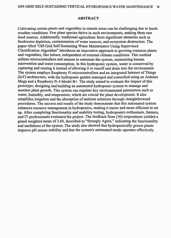 Off-grid self-sustaining vertical hydroponics water maintenance using supervised classification algorithm/ Novilyn D. Falcatan, Trisha Joy T. Lansigan, John Lorence G. Padua, Thedreine L. Panes, Japhet Elisha B. San Miguel