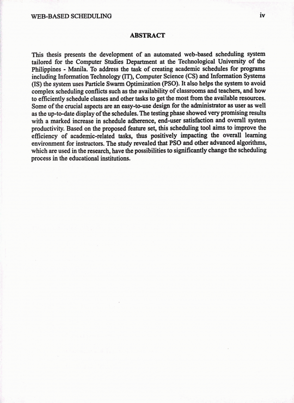Development of a web-based scheduling application for the computer studies department of TUP-Manila using particle swarm optimization/ Christian Victor A. Cifra, Ivan Lance T. Punzalan, James Benedict Torneros, Jan Aubrey A. Dela Cruz, Maryll John M. Agualada