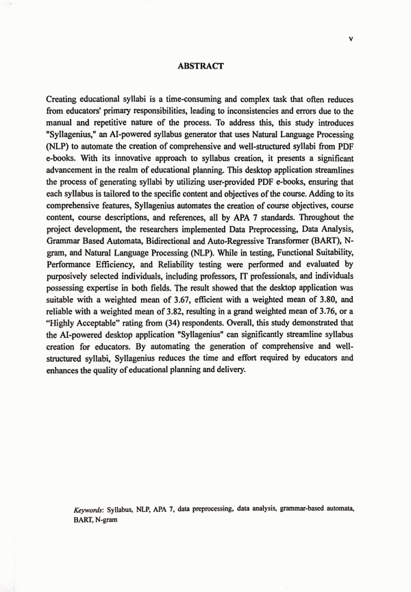 SYLLAGENIUS: an AI generic syllabus generator using NLP/ Elin Amalthea P. Espiritu, Kent Ivan R. Maguad, Khenneddy Onnasis M. Maten, Mark Angelo L. Salita, Roswell Nathan I. Chua--