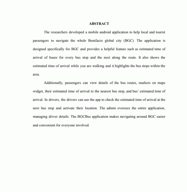Development of an Android-Based Mobile Application for Finding the Nearest Bus Stop and Predicting the Estimated Time of Arrival / Jeanne Mari S. Abag, Jermaine H. Menguito, Khaled R. Nofuente, Johanna Mae E. Roda, Jane Leslie A. Romano.