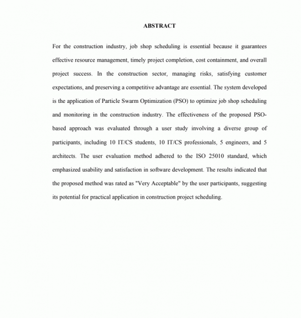 "For the construction industry, job shop scheduling is essential because it guarantees effective resource management, timely project completion, cost containment, and overall project success. In the construction sector, managing risks, satisfying customer expectations, and preserving a competitive advantage are essential. The system developed is the application of Particle Swarm Optimization (PSO) to optimize job shop scheduling and monitoring in the construction industry. The effectiveness of the proposed PSO-based approach was evaluated through a user study involving a diverse group of participants, including 10 IT/CS students, 10 IT/CS professionals, 5 engineers, and 5 architects. The user evaluation method adhered to the ISO 25010 standard, which emphasized usability and satisfaction in software development. The results indicated that the proposed method was rated as "Very Acceptable" by the user participants, suggesting its potential for practical application in construction project scheduling." -- Author's Abstract