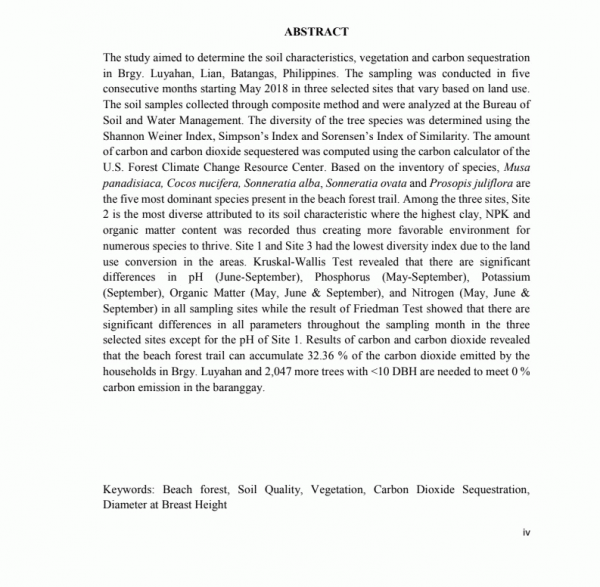 Dissertation note: College of Science -- Technological University of the Philippines, 2019. Bachelor of Science in Environmental Science, Abstract: "The study aimed to determine the soil characteristics, vegetation and carbon sequestration in Brgy. Luyahan, Lian, Batangas, Philippines. The sampling was conducted in five consecutive months starting May 2018 in three selected sites that vary based on land use. The soil samples collected through composite method and were analyzed at the Bureau of Soil and Water Management. The diversity of the tree species was determined using the Shannon Weiner Index, Simpson’s Index and Sorensen’s Index of Similarity. The amount of carbon and carbon dioxide sequestered was computed using the carbon calculator of the U.S. Forest Climate Change Resource Center. Based on the inventory of species, Musa panadisiaca, Cocos nucifera, Sonneratia alba, Sonneratia ovata and Prosopis juliflora are the five most dominant species present in the beach forest trail. Among the three sites, Site 2 is the most diverse attributed to its soil characteristic where the highest clay, NPK and organic matter content was recorded thus creating more favorable environment for numerous species to thrive. Site 1 and Site 3 had the lowest diversity index due to the land use conversion in the areas. Kruskal-Wallis Test revealed that there are significant differences in pH (June-September), Phosphorus (May-September), Potassium (September), Organic Matter (May, June & September), and Nitrogen (May, June & September) in all sampling sites while the result of Friedman Test showed that there are significant differences in all parameters throughout the sampling month in the three selected sites except for the pH of Site 1. Results of carbon and carbon dioxide revealed that the beach forest trail can accumulate 32.36 % of the carbon dioxide emitted by the households in Brgy. Luyahan and 2,047 more trees with <10 DBH are needed to meet 0 % carbon emission in the baranggay." -- Author's Abstract