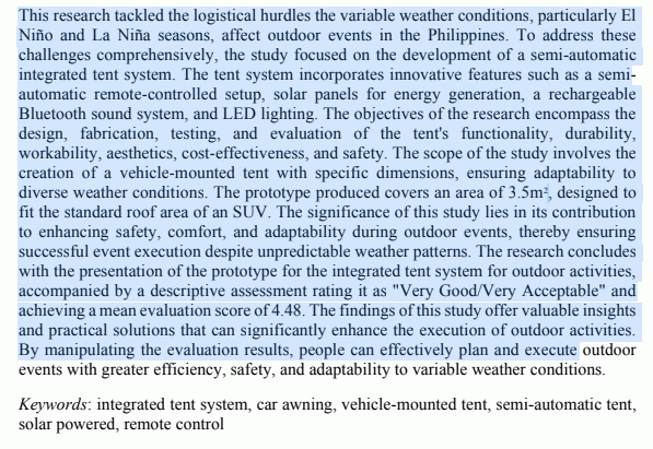 Development of semi-automatic integrated tent system for outdoor events/ Jean Kyla C. Abucay, John Erick Q. Macalalad, Christian C. Micael, Jorge Caly D.G. Panuelos, Dave B. Yaiso .--