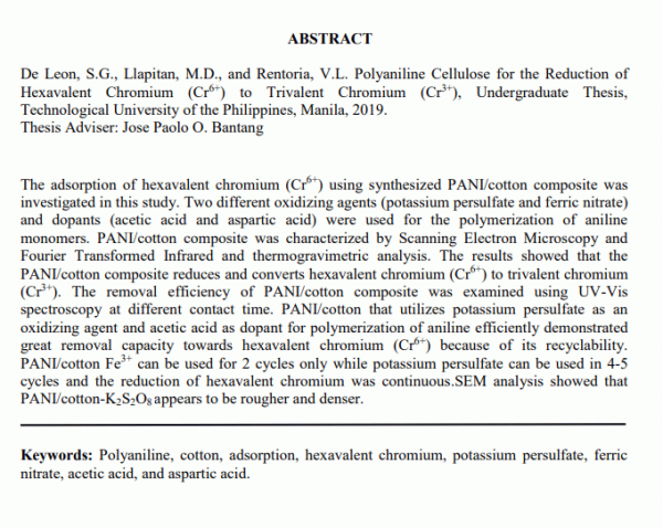Dissertation note: College of Science.-- Bachelor of Science major in Laboratory Technology: Technological University of the Philippines, 2019 Summary: The adsorption of hexavalent chromium (Cr6+) using synthesized PANI/cotton composite was investigated in this study. Two different oxidizing agents (potassium persulfate and ferric nitrate) and dopants (acetic acid and aspartic acid) were used for the polymerization of aniline monomers. PANI/cotton composite was characterized by Scanning Electron Microscopy and Fourier Transformed Infrared and thermogravimetric analysis. The results showed that the PANI/cotton composite reduces and converts hexavalent chromium (Cr6+) to trivalent chromium (Cr3+). The removal efficiency of PANI/cotton composite was examined using UV-Vis spectroscopy at different contact time. PANI/cotton that utilizes potassium persulfate as an oxidizing agent and acetic acid as dopant for polymerization of aniline efficiently demonstrated great removal capacity towards hexavalent chromium (Cr6+) because of its recyclability. PANI/cotton Fe3+ can be used for 2 cycles only while potassium persulfate can be used in 4-5 cycles and the reduction of hexavalent chromium was continuous.SEM analysis showed that PANI/cotton-K2S2O8 appears to be rougher and denser. Keywords: Polyaniline, cotton, adsorption, hexavalent chromium, potassium persulfate, ferric nitrate, acetic acid, and aspartic acid.