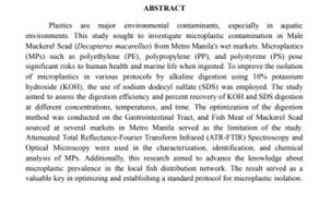 Determination of microplastics from galunggong (Decapterus macarellus): an optimization method/ Edgin V. Allunar, Angelika D. Benlayo, Jade Erica T. Burgos, and Ana Mae Kristine L. Sepro .--