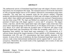 Antibacterial activity of formulated liquid hand soap with Alagaw (Premna odorata) leaf extract/ Rosemarie M. Intia, Anamae V. Olano, and Glaiza Mae C. Pabillo .--