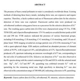 Dissertation note: College of Science .-- Bachelor of Applied Science in Laboratory Technology: Technological University of the Philippines, 2024. Summary: The presence of heavy metal pollutants in water is considered a worldwide threat. Existing methods of detecting these heavy metals, including ferric ions, are expensive and require expertise. Therefore, a facile synthesis and use of fluorescent carbon dots for the selective detection of ferric ions was explored. Fluorescent carbon dots were produced via solvothermal synthesis using guava leaves as a precursor for the selective detection of Fe3+ ions. The resulting guava carbon dots (G-CDs) were characterized using UV-Vis, FTIR, TEM-EDS, and a Spectrofluorophotometer. UV-Vis analysis revealed distinct peaks at 664 nm and 298 nm. FTIR analysis indicated the presence of various functional groups, including O-H stretching, C-H stretching, C=C stretching, C-O stretching, and C-H out-of- plane bend. TEM imaging revealed an average particle size of G-CDs measuring 8.7 nm with a quasi-spherical shape. EDS analysis confirmed an abundant presence of element carbon at 94.9%, with oxygen at 4.8%, and phosphorus at 0.3%. Spectrofluorophotometer produced a PL spectrum indicating an emission wavelength of 677 nm, corresponding to the red color of synthesized G-CDs. Selective ion detection of Fe3+ was also observed in the PL spectra along with the control containing G-CDs and EDTA with the selected metal ions: Hg2+, Zn2+, Cu2+and Pb2+. PL quenching was exhibited towards Fe3+ with no quenching for the remaining metal ions. High specificity in detecting Fe3+ was also observed in the concentration range of 100-400 μM, indicating a decrease in PL quenching.