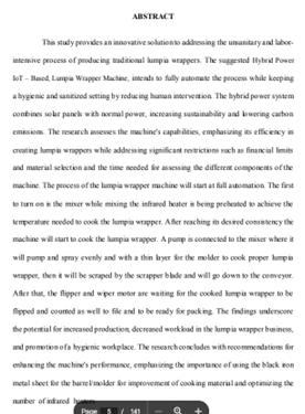 Dissertation note: College of Engineering.-- Bachelor of Science in Electrical Engineering: Technological University of the Philippines, 2024. Summary: This study provides an innovative solution to addressing the unsanitary and labor- intensive process of producing traditional lumpia wrappers. The suggested Hybrid Power IoT – Based, Lumpia Wrapper Machine, intends to fully automate the process while keeping a hygienic and sanitized setting by reducing human intervention. The hybrid power system combines solar panels with normal power, increasing sustainability and lowering carbon emissions. The research assesses the machine's capabilities, emphasizing its efficiency in creating lumpia wrappers while addressing significant restrictions such as financial limits and material selection and the time needed for assessing the different components of the machine. The process of the lumpia wrapper machine will start at full automation. The first to turn on is the mixer while mixing the infrared heater is being preheated to achieve the temperature needed to cook the lumpia wrapper. After reaching its desired consistency the machine will start to cook the lumpia wrapper. A pump is connected to the mixer where it will pump and spray evenly and with a thin layer for the molder to cook proper lumpia wrapper, then it will be scraped by the scrapper blade and will go down to the conveyor. After that, the flipper and wiper motor are waiting for the cooked lumpia wrapper to be flipped and counted as well to file and to be ready for packing. The findings underscore the potential for increased production, decreased workload in the lumpia wrapper business, and promotion ofa hygienic workplace. The research concludes with recommendations for enhancing the machine's performance, emphasizing the importance of using the black iron metal sheet for the barrel/molder for improvement of cooking material and optimizing the number of infrared heaters.