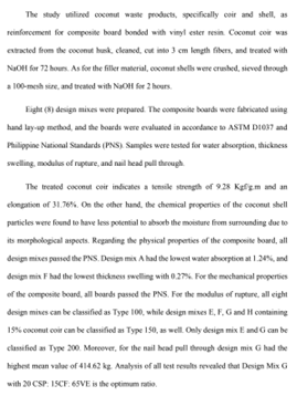 Property characterization of composite board utilizing coconut shell particles and coconut coir bonded with vinyl ester resin/ Rafael S. Agito, John Roque M. Angon, Christopher Avenda, Angelica E. Faller, John Daryll T. Lente, Kristine Jewel D. Nepales, and Aljohn G. Quilicol .--