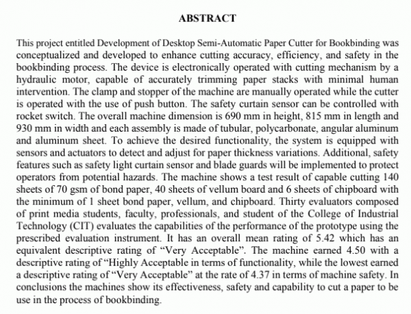 Development of desktop semi automatic paper cutter for bookbinding/ Archie B. Abancena, Richard L. Bisnar, Lalyn F. Gonzales, Angel T. Sacupan, Elmer F. Suba, and Roald Emmanuel L. Tolentino .--