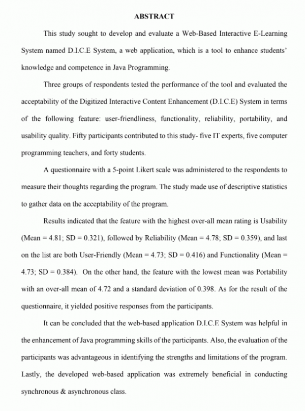 Dissertation note: College of Industrial Education. -- Master of Arts in Industrial Education Major in Educational Technology : Technological University of the Philippines, 2019. Summary: This study sought to develop and evaluate a Web-Based Interactive E-Learning System named D.I.C.E System, a web application, which is a tool to enhance students’ knowledge and competence in Java Programming. Three groups of respondents tested the performance of the tool and evaluated the acceptability of the Digitized Interactive Content Enhancement (D.I.C.E) System in terms of the following feature: user-friendliness, functionality, reliability, portability, and usability quality. Fifty participants contributed to this study- five IT experts, five computer programming teachers, and forty students. A questionnaire with a 5-point Likert scale was administered to the respondents to measure their thoughts regarding the program. The study made use of descriptive statistics to gather data on the acceptability of the program. Results indicated that the feature with the highest over-all mean rating is Usability (Mean = 4.81; SD = 0.321), followed by Reliability (Mean = 4.78; SD = 0.359), and last on the list are both User-Friendly (Mean = 4.73; SD = 0.416) and Functionality (Mean = 4.73; SD = 0.384). On the other hand, the feature with the lowest mean was Portability with an over-all mean of 4.72 and a standard deviation of 0.398. As for the result of the questionnaire, it yielded positive responses from the participants. It can be concluded that the web-based application D.I.C.E System was helpful in the enhancement of Java programming skills of the participants. Also, the evaluation of the participants was advantageous in identifying the strengths and limitations of the program. Lastly, the developed web-based application was extremely beneficial in conducting synchronous & asynchronous class.