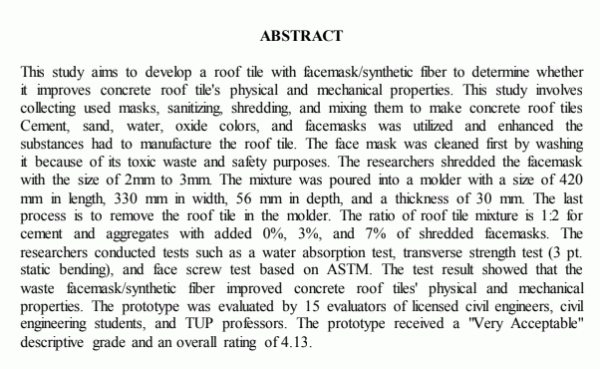 Dissertation note: College of Industrial Technology .-- Bachelor of Engineering Technology major in Construction Technology: Technological University of the Philippines, 2023. Summary: This study aims to develop a roof tile with facemask/synthetic fiber to determine whether it improves concrete roof tile's physical and mechanical properties. This study involves collecting used masks, sanitizing, shredding, and mixing them to make concrete roof tiles Cement, sand, water, oxide colors, and facemasks was utilized and enhanced the substances had to manufacture the roof tile. The face mask was cleaned first by washing it because of its toxic waste and safety purposes. The researchers shredded the facemask with the size of 2mm to 3mm. The mixture was poured into a molder with a size of 420 mm in length, 330 mm in width, 56 mm in depth, and a thickness of 30 mm. The last process is to remove the roof tile in the molder. The ratio of roof tile mixture is 1:2 for cement and aggregates with added 0%, 3%, and 7% of shredded facemasks. The researchers conducted tests such as a water absorption test, transverse strength test (3 pt. static bending), and face screw test based on ASTM. The test result showed that the waste facemask/synthetic fiber improved concrete roof tiles' physical and mechanical properties. The prototype was evaluated by 15 evaluators of licensed civil engineers, civil engineering students, and TUP professors. The prototype received a "Very Acceptable" descriptive grade and an overall rating of 4.13.