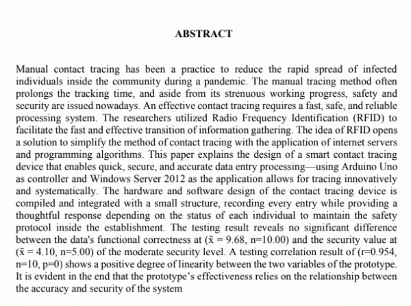 Dissertation note: College of Industrial Technology .-- Bachelor of Engineering Technology major in Electronics Engineering Technology: Technological University of the Philippines, 2022. Summary: Manual contact tracing has been a practice to reduce the rapid spread of infected individuals inside the community during a pandemic. The manual tracing method often prolongs the tracking time, and aside from its strenuous working progress, safety and security are issued nowadays. An effective contact tracing requires a fast, safe, and reliable processing system. The researchers utilized Radio Frequency Identification (RFID) to facilitate the fast and effective transition of information gathering. The idea of RFID opens a solution to simplify the method of contact tracing with the application of internet servers and programming algorithms. This paper explains the design of a smart contact tracing device that enables quick, secure, and accurate data entry processing—using Arduino Uno as controller and Windows Server 2012 as the application allows for tracing innovatively and systematically. The hardware and software design of the contact tracing device is compiled and integrated with a small structure, recording every entry while providing a thoughtful response depending on the status of each individual to maintain the safety protocol inside the establishment. The testing result reveals no significant difference between the data's functional correctness at (x̄ = 9.68, n=10.00) and the security value at (x̄ = 4.10, n=5.00) of the moderate security level. A testing correlation result of (r=0.954, n=10, p=0) shows a positive degree of linearity between the two variables of the prototype. It is evident in the end that the prototype’s effectiveness relies on the relationship between the accuracy and security of the system