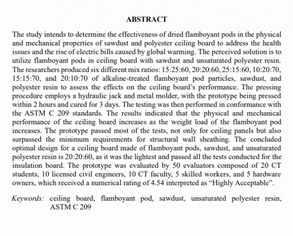 Dissertation note: College of Industrial Technology .-- Bachelor of Engineering Technology major in Construction Technology: Technological University of the Philippines, 2025 Summary: The study intends to determine the effectiveness of dried flamboyant pods in the physical and mechanical properties of sawdust and polyester ceiling board to address the health issues and the rise of electric bills caused by global warming. The perceived solution is to utilize flamboyant pods in ceiling board with sawdust and unsaturated polyester resin. The researchers produced six different mix ratios: 15:25:60, 20:20:60, 25:15:60, 10:20:70, 15:15:70, and 20:10:70 of alkaline-treated flamboyant pod particles, sawdust, and polyester resin to assess the effects on the ceiling board’s performance. The pressing procedure employs a hydraulic jack and metal molder, with the prototype being pressed within 2 hours and cured for 3 days. The testing was then performed in conformance with the ASTM C 209 standards. The results indicated that the physical and mechanical performance of the ceiling board increases as the weight load of the flamboyant pod increases. The prototype passed most of the tests, not only for ceiling panels but also surpassed the minimum requirements for structural wall sheathing. The concluded optimal design for a ceiling board made of flamboyant pods, sawdust, and unsaturated polyester resin is 20:20:60, as it was the lightest and passed all the tests conducted for the insulation board. The prototype was evaluated by 50 evaluators composed of 20 CT students, 10 licensed civil engineers, 10 CT faculty, 5 skilled workers, and 5 hardware owners, which received a numerical rating of 4.54 interpreted as “Highly Acceptable”. Keywords: ceiling board, flamboyant pod, sawdust, unsaturated polyester resin, ASTM C 209