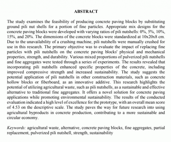concrete paving blocks were developed with varying ratios of pili nutshells: 0%, 5%, 10%,