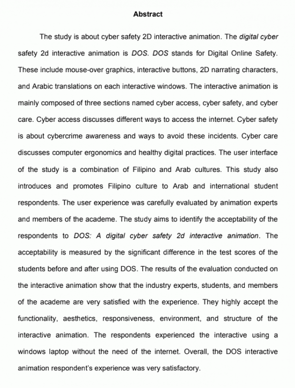 The study is about cyber safety 2D interactive animation. The digital cyber safety 2d interactive animation is DOS. DOS stands for Digital Online Safety. These include mouse-over graphics, interactive buttons, 2D narrating characters, and Arabic translations on each interactive windows. The interactive animation is mainly composed of three sections named cyber access, cyber safety, and cyber care. Cyber access discusses different ways to access the internet. Cyber safety is about cybercrime awareness and ways to avoid these incidents. Cyber care discusses computer ergonomics and healthy digital practices. The user interface of the study is a combination of Filipino and Arab cultures. This study also introduces and promotes Filipino culture to Arab and international student respondents. The user experience was carefully evaluated by animation experts and members of the academe. The study aims to identify the acceptability of the respondents to DOS: A digital cyber safety 2d interactive animation. The acceptability is measured by the significant difference in the test scores of the students before and after using DOS. The results of the evaluation conducted on the interactive animation show that the industry experts, students, and members of the academe are very satisfied with the experience. They highly accept the functionality, aesthetics, responsiveness, environment, and structure of the