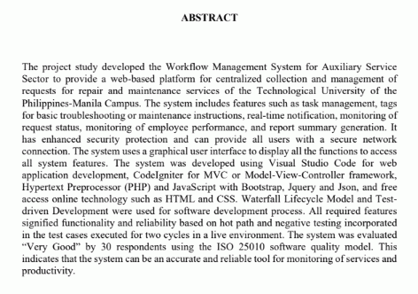 The project study developed the Workflow Management System for Auxiliary Service Sector to provide a web-based platform for centralized collection and management of requests for repair and maintenance services of the Technological University of the Philippines-Manila Campus. The system includes features such as task management, tags for basic troubleshooting or maintenance instructions, real-time notification, monitoring of request status, monitoring of employee performance, and report summary generation. It has enhanced security protection and can provide all users with a secure network connection. The system uses a graphical user interface to display all the functions to access all system features. The system was developed using Visual Studio Code for web application development, CodeIgniter for MVC or Model-View-Controller framework, Hypertext Preprocessor (PHP) and JavaScript with Bootstrap, Jquery and Json, and free access online technology such as HTML and CSS. Waterfall Lifecycle Model and Test-driven Development were used for software development process. All required features signified functionality and reliability based on hot path and negative testing incorporated in the test cases executed for two cycles in a live environment. The system was evaluated “Very Good” by 30 respondents using the ISO 25010 software quality model. This indicates that the system can be an accurate and reliable tool for monitoring of services and productivity.