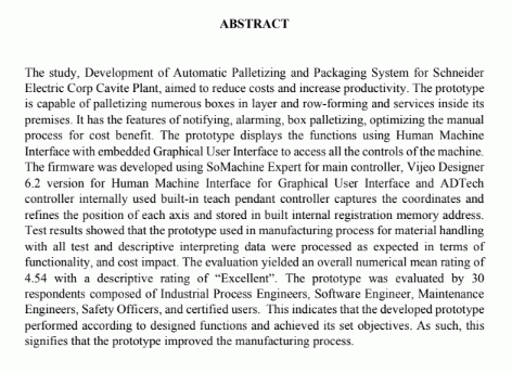 The study, Development of Automatic Palletizing and Packaging System for Schneider Electric Corp Cavite Plant, aimed to reduce costs and increase productivity. The prototype is capable of palletizing numerous boxes in layer and row-forming and services inside its premises. It has the features of notifying, alarming, box palletizing, optimizing the manual process for cost benefit. The prototype displays the functions using Human Machine Interface with embedded Graphical User Interface to access all the controls of the machine. The firmware was developed using SoMachine Expert for main controller, Vijeo Designer 6.2 version for Human Machine Interface for Graphical User Interface and ADTech controller internally used built-in teach pendant controller captures the coordinates and refines the position of each axis and stored in built internal registration memory address. Test results showed that the prototype used in manufacturing process for material handling with all test and descriptive interpreting data were processed as expected in terms of functionality, and cost impact. The evaluation yielded an overall numerical mean rating of 4.54 with a descriptive rating of “Excellent”. The prototype was evaluated by 30 respondents composed of Industrial Process Engineers, Software Engineer, Maintenance Engineers, Safety Officers, and certified users. This indicates that the developed prototype performed according to designed functions and achieved its set objectives. As such, this signifies that the prototype improved the manufacturing process.