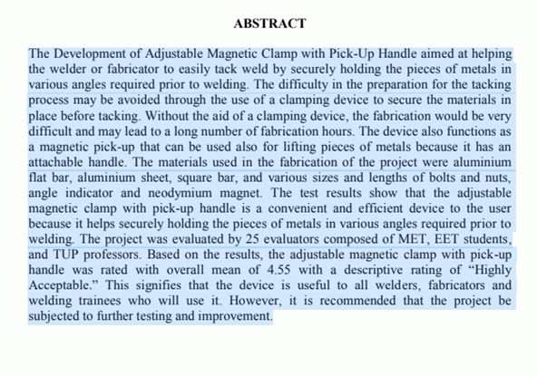and TUP professors. Based on the results, the adjustable magnetic clamp with pick-up