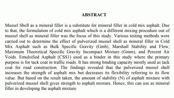 Mussel Shell as a mineral filler is a substitute for mineral filler in cold mix asphalt. Due