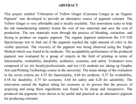 Utilization Of Yellow Ginger (Curcuma Longa) As An Organic Pigment/ Alfrancis M. Bellosillo, Mark Harvey M. Espiritu, Joyce L. Francisco and Omar Ali A. Khalifa.--