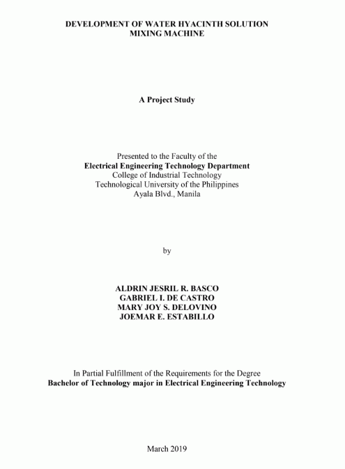 Development of water hyacinth solution mixing machine / Aldrin Jesril R. Basco, Gabriel I. De Castro, Mary Joy S. Delovino, Joemar E. Estabillo.