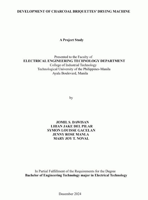 Development of charcoal briquettes' drying machine / Jomil S. Dawisan, Lhian Jake Del Pilar, Symon Louisse Gacelan, Jenny Rose Manla, Mary Joy T. Noval.