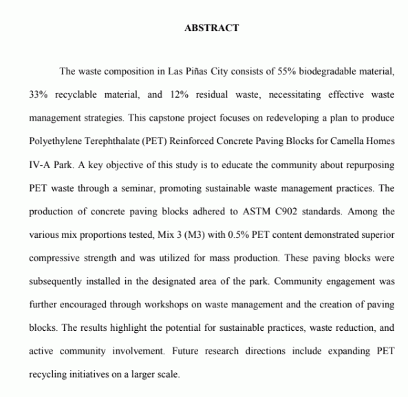 Redevelopment plan and production of polyethylene terephthalate (pet) reinforced concrete paving blocks for camella homes iv-a park, barangay pamplona tres, las piñas city/ Ma. Geovinah C. Amasula, Jester V. Dalisay Jay, Andrey E. Glaban, Nelson Jr. S. Olaguer, Jam Leynard, M. Resuello, and Kyla A. Sotto.--