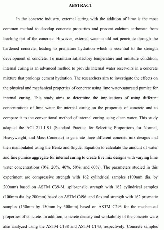 Effects of lime water-saturated pumice aggregate for internal curing on the physical and mechanical properties of concrete/ Mel Patricia M. Cabrera, Kenneth Luis T. Dandal, Jhon Oliver A. De Jose, Romelito T. Dela Cruz, Fumie E. Komori, and Mierell Louise V. Ramos.--
