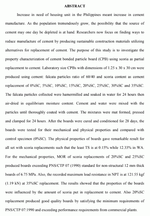 Property characterization of cement-bounded particle board using powdered scoria as partial replacement to cement and waste falcata particles as raw materials/ Evangeline M. Aguando, Alyssa Marie P. Camilon, Monette V. Nedic, and John Patrick B. Vicencio.--