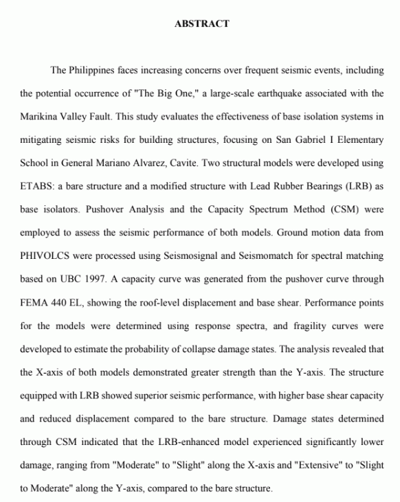 Seismic assessment of 3d structural model and design of san gabriel I elementary school building utilizing capacity spectrum method: Integrating retrofitting approach using lead rubber bearing support/ Piolo Jandel A. Cometa, John Paul S. Floro, Kathy May C. Gregorio, Reimark Jason R. Guran, Vanessa Anne T. Madriaga, Lynlee Bless F. Villanueva.--