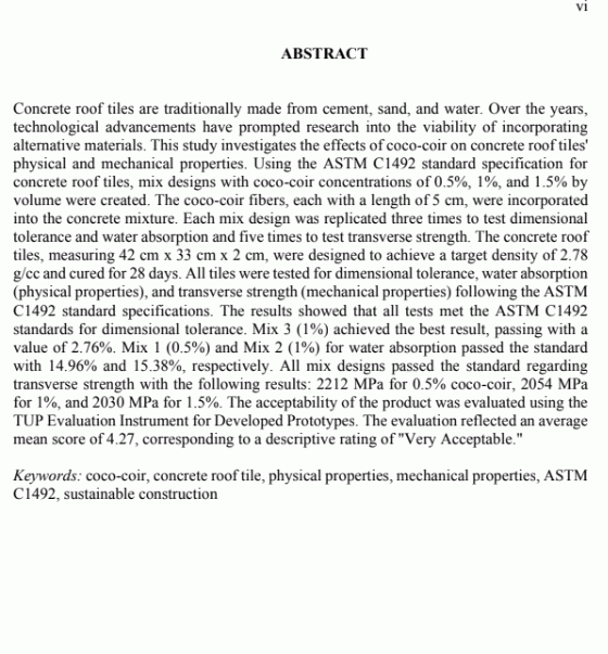 Effects of coco-coir on the physical and mechanical properties of concrete roof tile/ Ma. Kate Owen G. Cahilig, Kristelle S. Dela Cruz ,chichi F. Hijapon, Jomalyn R. Nilo, Jovelyn R. Tabernilla, And Jhan Mark H. Usop.--