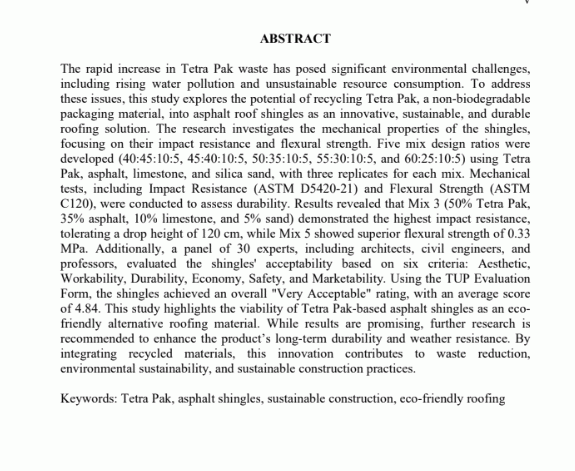 of 4.84. This study highlights the viability of Tetra Pak-based asphalt shingles as an eco-