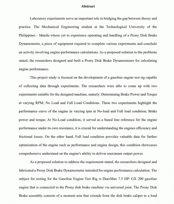Dissertation note: College of Engineering.-- Bachelor of science in mechanical engineering: Technological University of the Philippines, 2024. Summary: Laboratory experiments serve an important role in bridging the gap between theory and practice. The Mechanical Engineering student at the Technological University of the Philippines- Manila whose yet to experience operating and handling of a Prony Disk Brake Dynamometer, a piece of equipment required to complete various experiments and conclude an activity involving engine performance calculations. As a proposed solution to the problems stated, the rescarchers designed and built a Prony Disk Brake Dynamometer for calculating engine performance. This project study is focused on the development of a gasoline engine test rig capable of collecting data through experiments. The researchers were able to come up with two experiments suitable for the designed machinc, namely: Dctermining Brake Power and Torque at varying RPM; No Load and Full Load Conditions. These two experiments highlight the performance curve of the engine in varying rpm at No-load and Full load condition: Brake power and torque. At No-Load condition, it served as a based line reference for the engine performance under its own resistance, it is crucial for understanding the engines efticiency and frictional losses. On the other hand, Full load condition provides valuable data for further optimization of the engine such as performance and engine design, this condition showcases comprehensive understand on the engine's ability to deliver maximumn output power. As a proposcd solution to address the requirement stated, the researchers designed and fabricatecd a Prony Disk Brake Dynamometer intended for engine performance calculation. The subject for testing for the Gasoline Engine Test Rig is DuroMax 7.5 HP/ GX 200 gasoline cngine that is connected to the Prony disk brake machine via universal joint. The Prony Disk Brake assembly consists of a momnent arm that extends from the disk brake caliper to a load