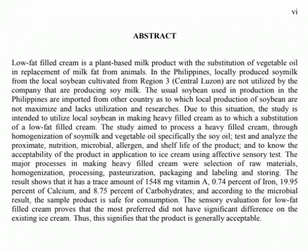Utilization of soy milk in making low fat filled cream/ Mary Rose P. Azur, Mikaela R. Quines, Jake R. Ricamora, and Ester Joy Z. Tuyor.--
