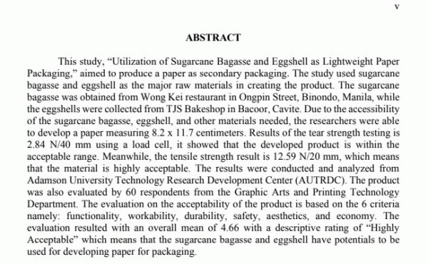Dissertation note: College of Industrial Technology.-- Bachelor of technology major in print media technology: Technological University of the Philippines, 2025. Summary: This study, “Utilization of Sugarcane Bagasse and Eggshell as Lightweight Paper Packaging,” aimed to produce a paper as secondary packaging. The study used sugarcane bagasse and eggshell as the major raw materials in creating the product. The sugarcane bagasse was obtained from Wong Kei restaurant in Ongpin Street, Binondo, Manila, while the eggshells were collected from TJS Bakeshop in Bacoor, Cavite. Due to the accessibility of the sugarcane bagasse, eggshell, and other materials needed, the researchers were able to develop a paper measuring 8.2 x 11.7 centimeters. Results of the tear strength testing is 2.84 N/40 mm using a load cell, it showed that the developed product is within the acceptable range. Meanwhile, the tensile strength result is 12.59 N/20 mm, which means that the material is highly acceptable. The results were conducted and analyzed from Adamson University Technology Research Development Center (AUTRDC). The product was also evaluated by 60 respondents from the Graphic Arts and Printing Technology Department. The evaluation on the acceptability of the product is based on the 6 criteria namely: functionality, workability, durability, safety, aesthetics, and economy. The evaluation resulted with an overall mean of 4.66 with a descriptive rating of “Highly Acceptable” which means that the sugarcane bagasse and eggshell have potentials to be used for developing paper for packaging.