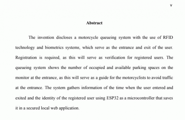 Development of motorcycle parking queuing system/ Tobey B. Habal, Rovic Evan E. Laurella, Cherry Mae M. Manlunas, Robert S. Orsilada, James Nico P. Quintos, and Marvin Joshua V. Tejedor.--