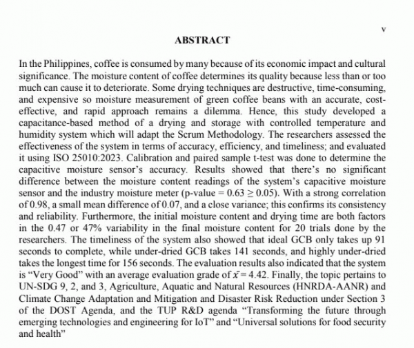 Moisture level detector for green coffee bean using capacitive method and iot/ Ralph C. Admendilla, Ma. Cristina L. Agustin, Pamela Sabelle D. Nagusara, Clive Joriz M. Oxima, and Denisse P. Quejada.--