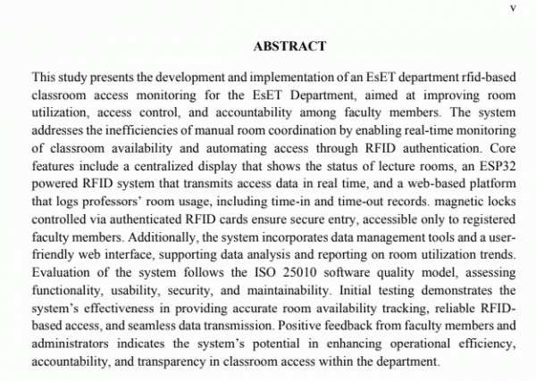 Eset department rfid-based classroom access monitoring/ Regene Dessa B. Barlongay, Sharmaine R. Billote, Divine Grace A. De Mesa, Precious Daniella D. Mapa, and Crysthel Anne M. Martorillas.--