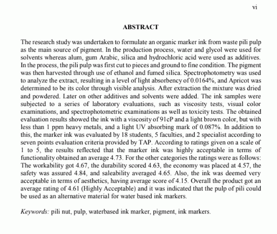 The research study was undertaken to formulate an organic marker ink from waste pili pulp