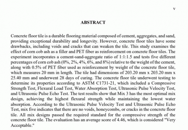 Effects of corn cob ash as filler in pet fiber-reinforced concrete floor tiles/ Ian Joshua Bonglo, Kate Jazelle S. Bulahan, Ma. Danica Sb. Cabugawan, Lance Isaac M. Diano, and Jia Kate L. Solis.--