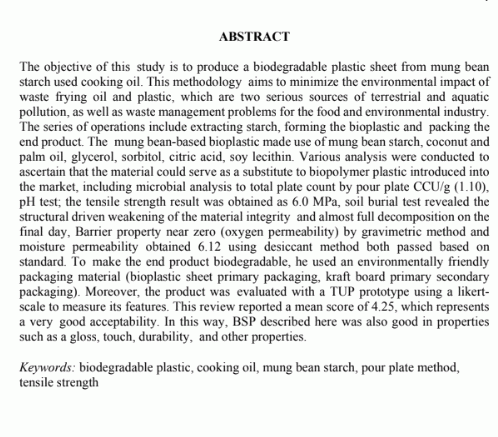 The objective of this study is to produce a biodegradable plastic sheet from mung bean