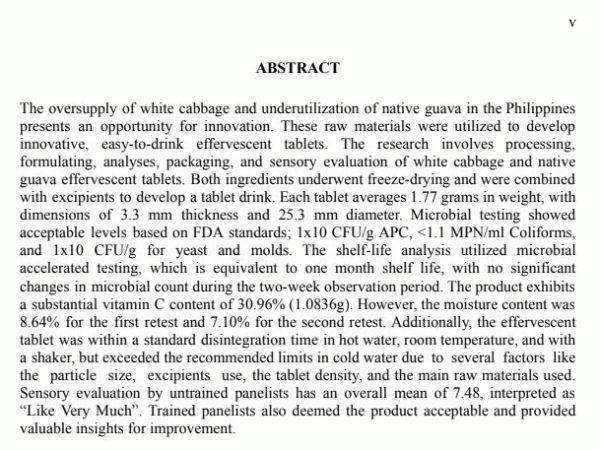 Development of an effervescent tablet drink utilizing white cabbage (brassica oleracea var. capitata) and native guava (psidium guajava linn)/ Emma Angela D. Laqui, Rochelle Mae M. Mendoza, Beram James A. Pasia, Geraldine Mae D. Rivera, and Rj B. Tabasa.--