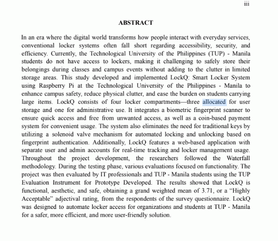 Lockq: development of smart locker system using raspberry pi at the technological university of the philippines-manila/ Mark James J. Cautibar, Charrie Lou P. De Jose, Jennifer E. Peralta, and Allen Joy C. Signo.--