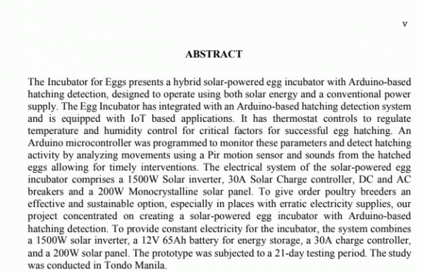 Development of a solar-powered incubator for eggs with arduino-based hatching detection/ Jayson G. Conde, Rhodane Marshall C. Larcia, Eugene Dj Navales, Nathaniel V. Olande, and Rangel B. Untivero.--