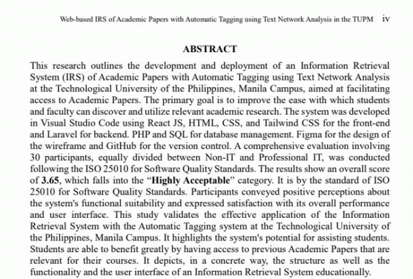 Dissertation note: College of Science.-- Bachelor of science in computer science: Technological University of the Philippines, 2025. Summary: This research outlines the development and deployment of an Information Retrieval System (IRS) of Academic Papers with Automatic Tagging using Text Network Analysis at the Technological University of the Philippines, Manila Campus, aimed at facilitating access to Academic Papers. The primary goal is to improve the ease with which students and faculty can discover and utilize relevant academic research. The system was developed in Visual Studio Code using React JS, HTML, CSS, and Tailwind CSS for the front-end and Laravel for backend. PHP and SQL for database management. Figma for the design of the wireframe and GitHub for the version control. A comprehensive evaluation involving 30 participants, equally divided between Non-IT and Professional IT, was conducted following the ISO 25010 for Software Quality Standards. The results show an overall score of 3.65, which falls into the “Highly Acceptable” category. It is by the standard of ISO 25010 for Software Quality Standards. Participants conveyed positive perceptions about the system's functional suitability and expressed satisfaction with its overall performance and user interface. This study validates the effective application of the Information Retrieval System with the Automatic Tagging system at the Technological University of the Philippines, Manila Campus. It highlights the system's potential for assisting students. Students are able to benefit greatly by having access to previous Academic Papers that are relevant for their courses. It depicts, in a concrete way, the structure as well as the functionality and the user interface of an Information Retrieval System educationally.