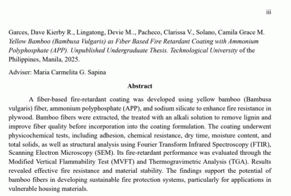 Yellow bamboo (bambusa vulgaris) as fiber based fire retardant coating with ammonium polyphosphate (app)/ Dave Kierby R. Garces, Devie M. Lingatong, Clarissa V. Pacheco, and Camila Grace M. Solano.--
