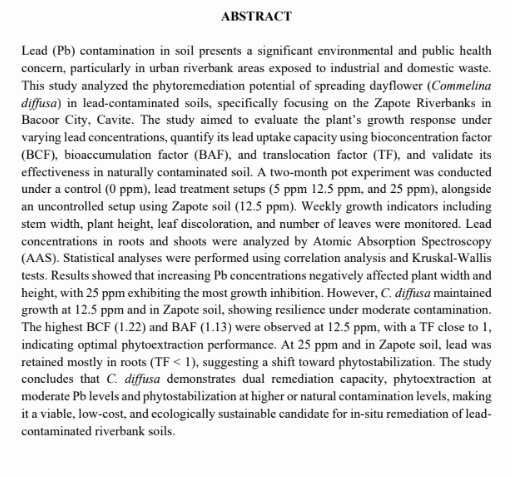 Phytoremediation potential of spreading dayflower (commelina diffusa) for lead contamination in soil along the zapote riverbanks, bacoor city, cavite/ Nadine Royce T. Nuñez, Yvonne P. Pallino, Jon Rhuzzel S. Paura, and Jeverson T. Rosario.--