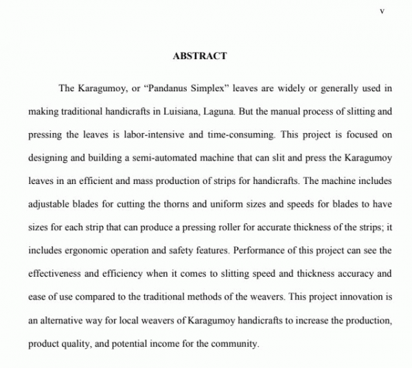 Design and fabrication of a semi automated karagumoy leaves slitter machine for karagumoy strips production/ Kurt Alleikhane C. Arenos, Noah B. Cajurao, Carl Eymard B. Datoy, Blair Valdwin D. Mabanan, and John Anthony P. Valdez.--