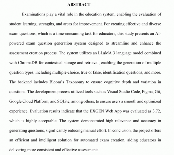 Exgen: an innovative web-based system approach to automated examination design using retrieval al-augmented generation and large language model/ Vashti Karmelli V. Camu, Diane Mae M. Corcino, Patrick I. Nacario, Jamie Jasmine D. Saño, and Paul Adrian O. Torres.--